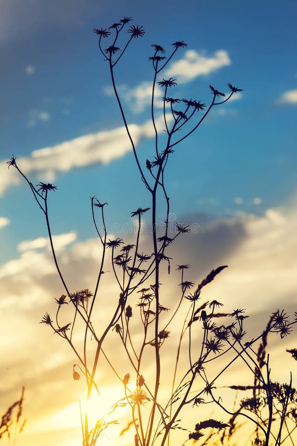 Droog gras en zonsondergang. Droge gras en hemel met zonsondergang