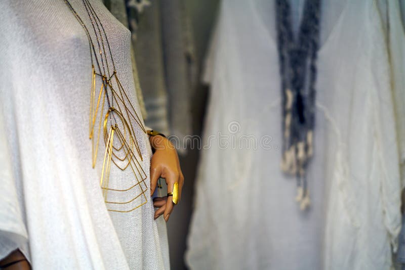 Nice detail of a mannequin in the window of a shop in Parikia, Greece neck cotton color craft feminine beautiful scarf background summer wearing clothing many fashion different hanging shopping nobody accessories polka-dot neckerchief heat personality life bright autumn light garment colorful neck-piece curiosity style winter spring headscarf object wardrobe white isolated elegance thread closeup shawl mix female