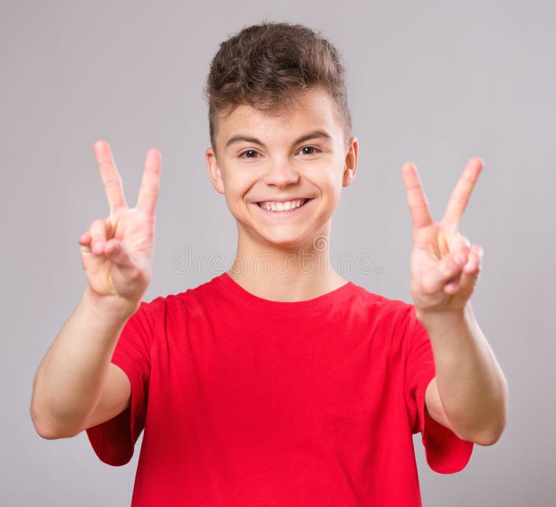 Het Portret van de Jongen van de tiener. Close-up emotioneel portret van Kaukasische tienerjongen die rode t-shirt dragen Grappige tiener die die overwinningsgebaar maken, op witte achtergrond wordt geïsoleerd Het knappe kind lachen die zeer gelukkig kijken