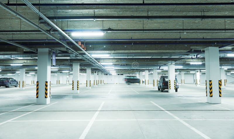 Horizontaal beeld van schone witte ondergrondse parkeerplaats.