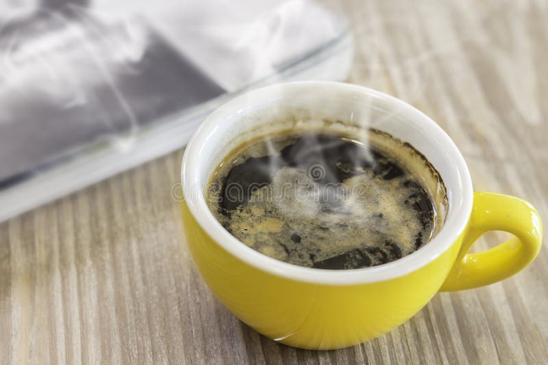 Mok op tijdschrift in koffie. Gele mok met tijdschrift op houten lijst in koffie