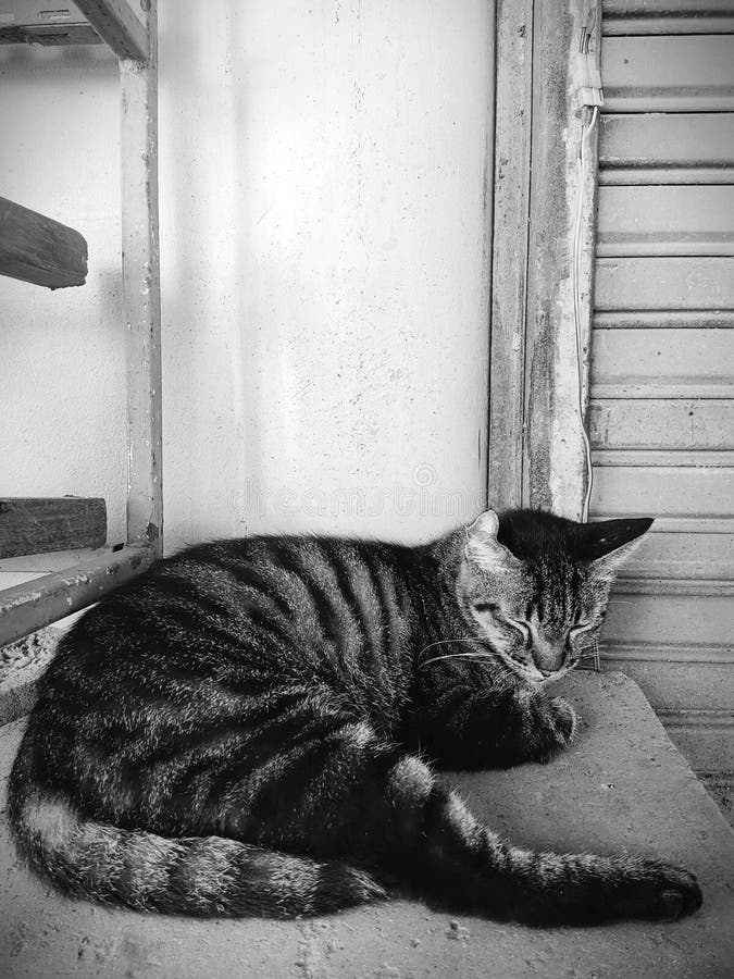 Portret van een slapende gestreepte jonge kat. De tabby kat rust uit