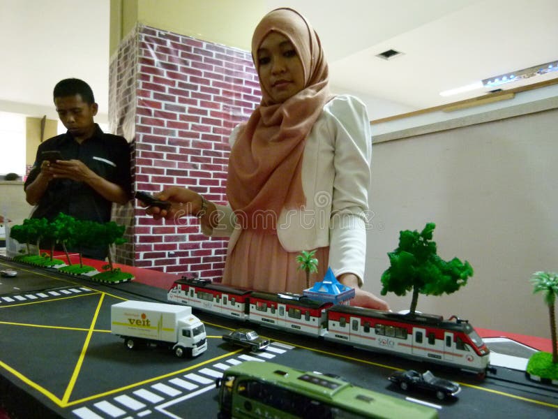 Miniatuurspoorweg. Spoorwegminiatuur bij het speelgoed Expo in een wandelgalerijatrium wordt getoond in Karanganyar, Centraal Java, Indonesië dat