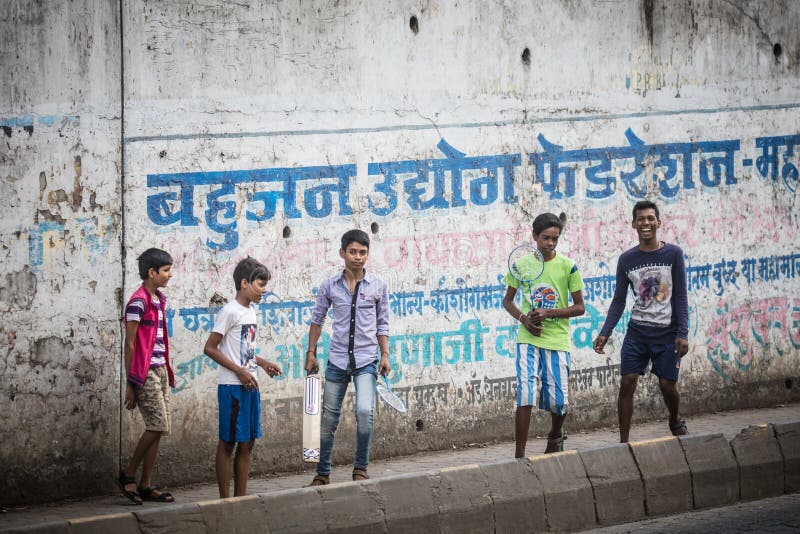 Het Indische Jonge geitjes Spelen. MUMBAI, INDIA - November 11 2017: Een groep Indische jonge geitjes speelt sport in de straat in Airoli, Mumbai, India