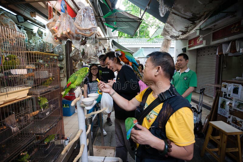 Mensen in de Vogeltuin in Hong Kong. HONG KONG, CHINA - NOVEMBER 11, 2012: Toeristen en plaatselijke bewoners in de de Vogeltuin van de vogelmarkt. De markt wordt gevestigd op het Kowloon-schiereiland, en is één van de grootste en populairste vogelmarkten in de wereld.