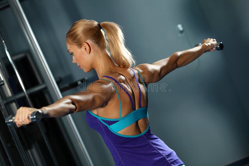 Schoudertraining. Afbeelding van een fit meisje in de sportschool die traint met dumbbells