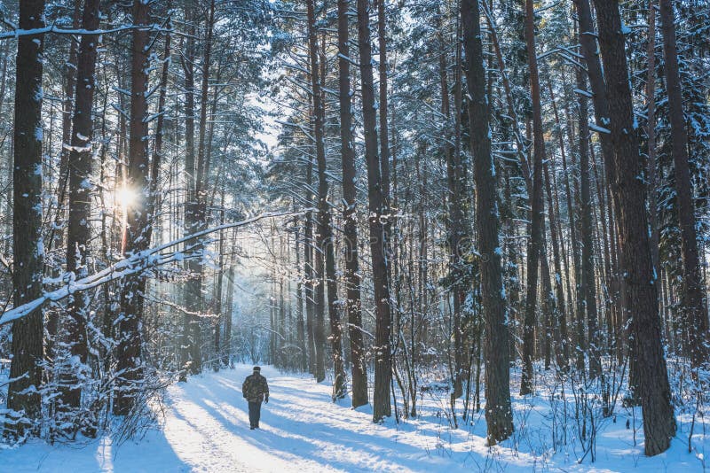 Bevroren bos. Zonnestralen van de de winter de boszonsondergang, Litouwen