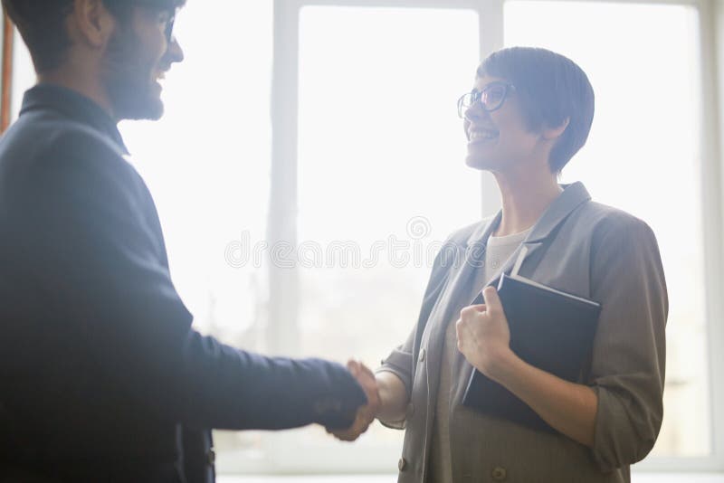 Handdruk na Goede Overeenkomst. Twee partners die handen met glimlach bevindend agains venster schudden na de voltooiing van succesvolle transactie