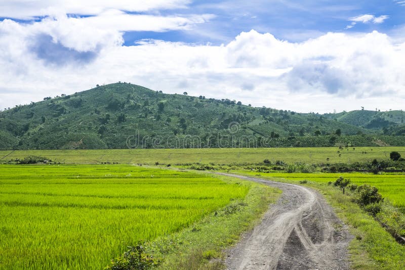Kleine weg aan het padieveld. Padieveld in Di Linh, Lam Dong, Vietnam