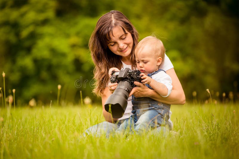 Moeder, kind en camera. Moeder laat haar kind de gemaakte foto's zien op een DSLR-camera, buiten in de natuur