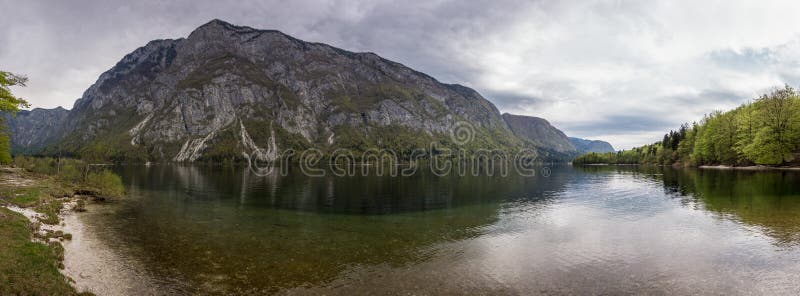 Panorama of lake bohinj also called bohinjsko jezero on a sunny winter afternoon is major landmark the julian tranquil nestled in royalty-vrije stock foto panorama of lake bohinj also called bohinjsko jezero on a sunny winter afternoon is major landmark the julian tranquil nestled in