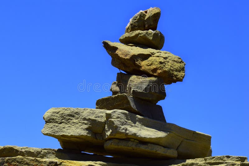 Piramide van stenen. Piramide van steen in Griekenland, in Rhodos, Prasonisi. Blauwe achtergrond.