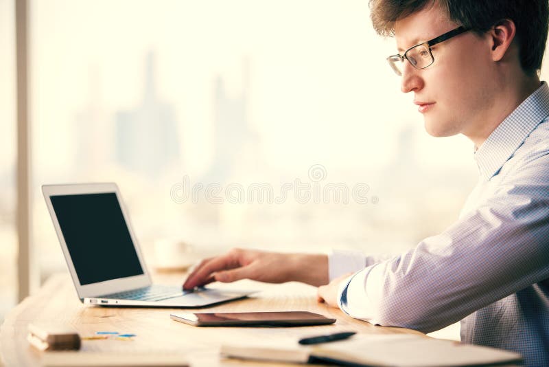 Zakenman die laptop met behulp van. Sideview van Kaukasische zakenman die laptop op houten Desktop met tablet en andere punten op onscherpe stadsachtergrond gebruiken