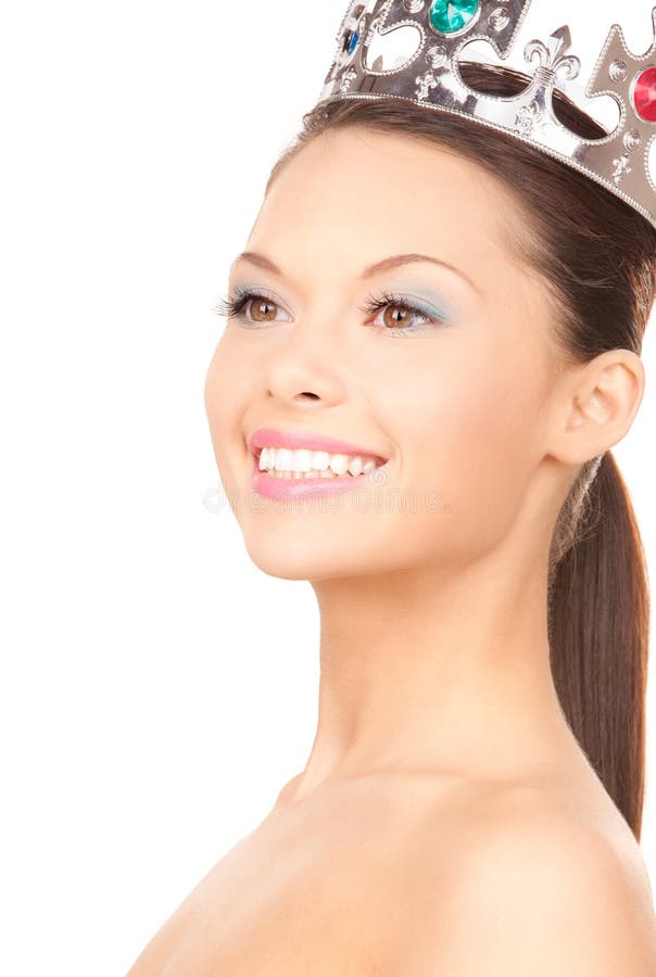Beeld van mooie vrouw in kroon over wit