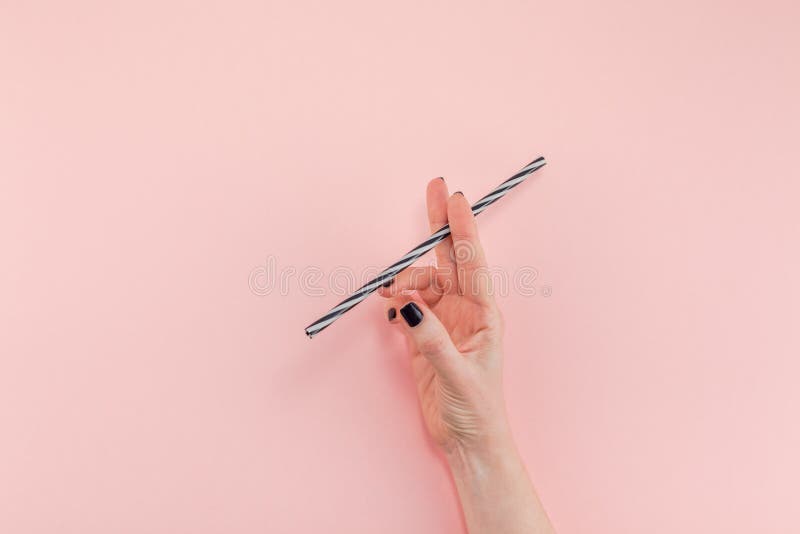 Vrouwenhand met cocktail het drinken stro. De creatieve hoogste meningsvlakte legt van vrouwenhand met zwart de cocktail van de manicureholding het drinken stro zoals sigaret met exemplaar ruimte roze document achtergrondminimalismstijl Sociale media van de malplaatje de vrouwelijke blog