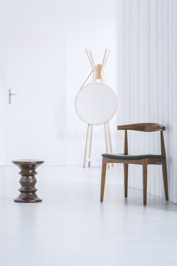 Zwarte ontwerperlijst in gang. Zwarte ontwerperlijst en houten stoel in heldere gang met spiegel op hanger